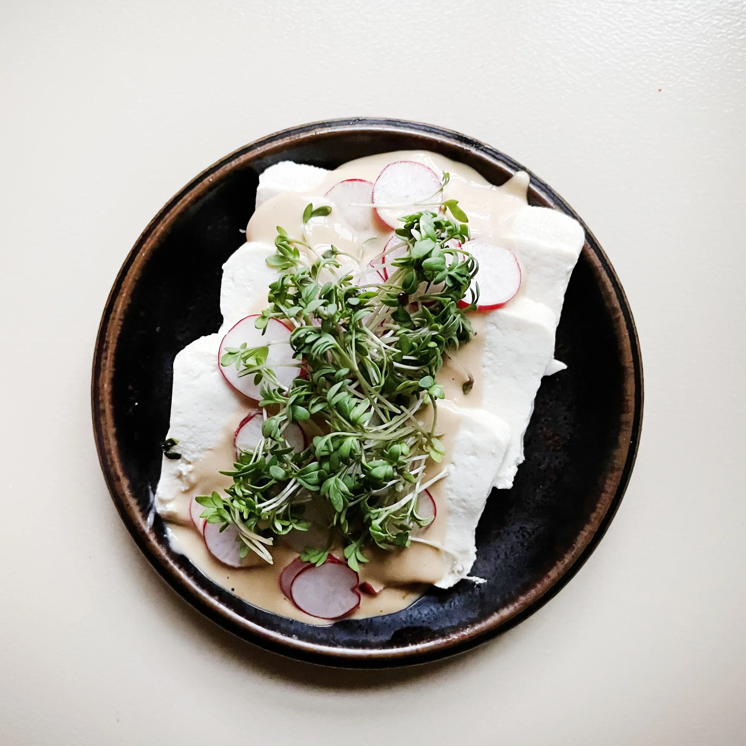 4. Hæld dressingen over tofuen og pynt med radiser og spirer🌱